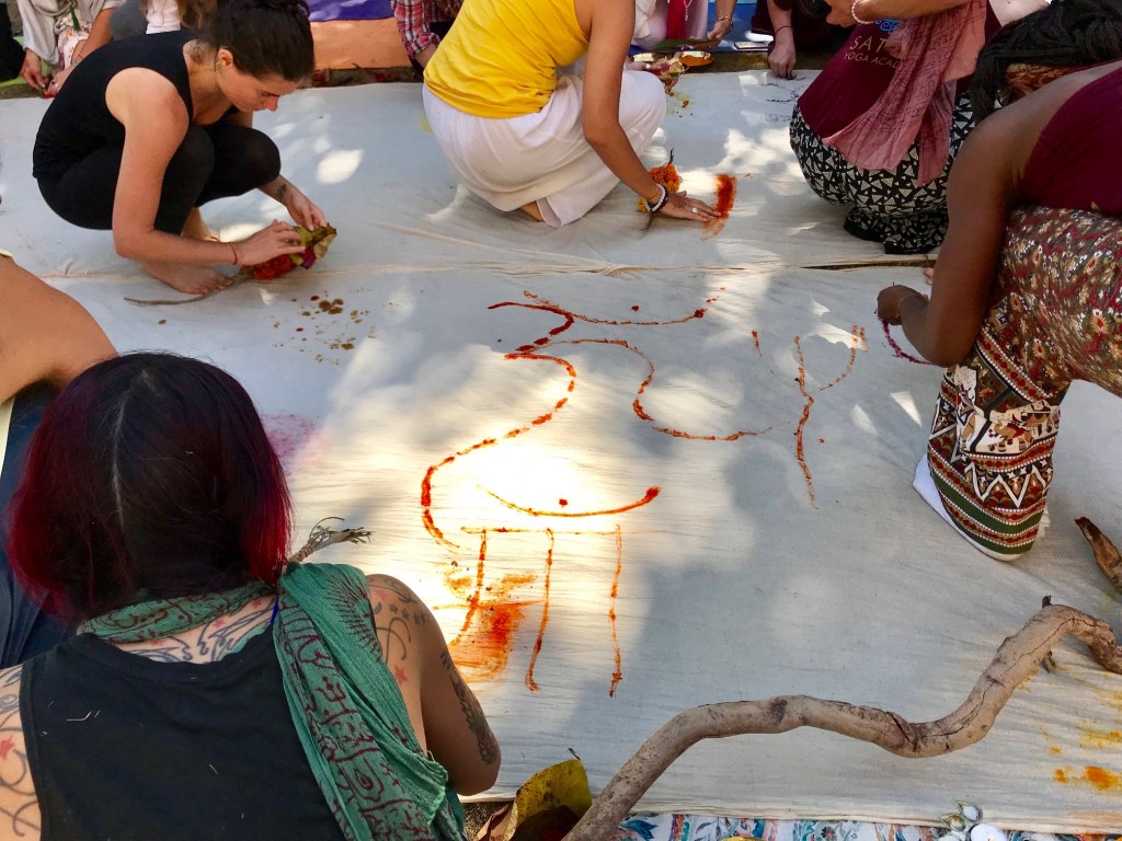 A collective EarthPainting ritual is particularly powerful as an opening or closing ceremony. As an opening, it creates immediate group cohesion – strangers become collaborators through shared touch, color, and intention. As a closing, it offers a true sense of completion. A tangible and sensorial experience of the threads of connections woven together, a powerful image of having co-create something together that could not have existed otherwise.
