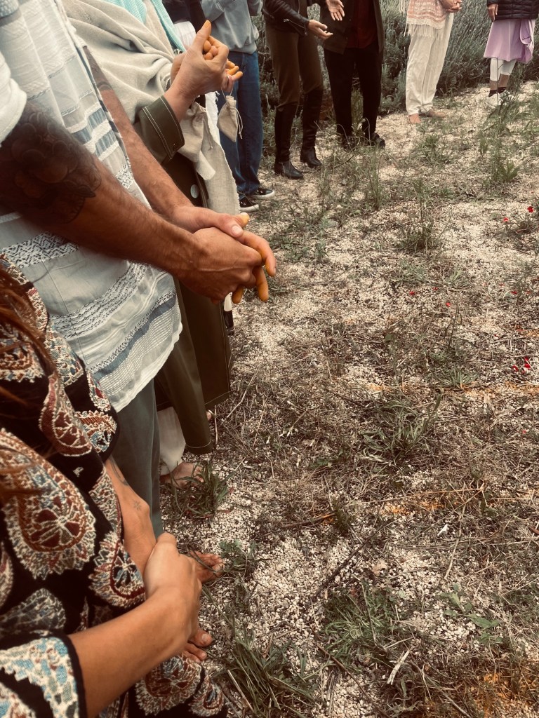 The ritual typically begins with slowing down. Walking. Breathing. Gathering natural elements with respect and care. This act alone – intentional, with curiosity rather than efficiency – already begins to shift the relational field. People start noticing things, finding their own rhythm.