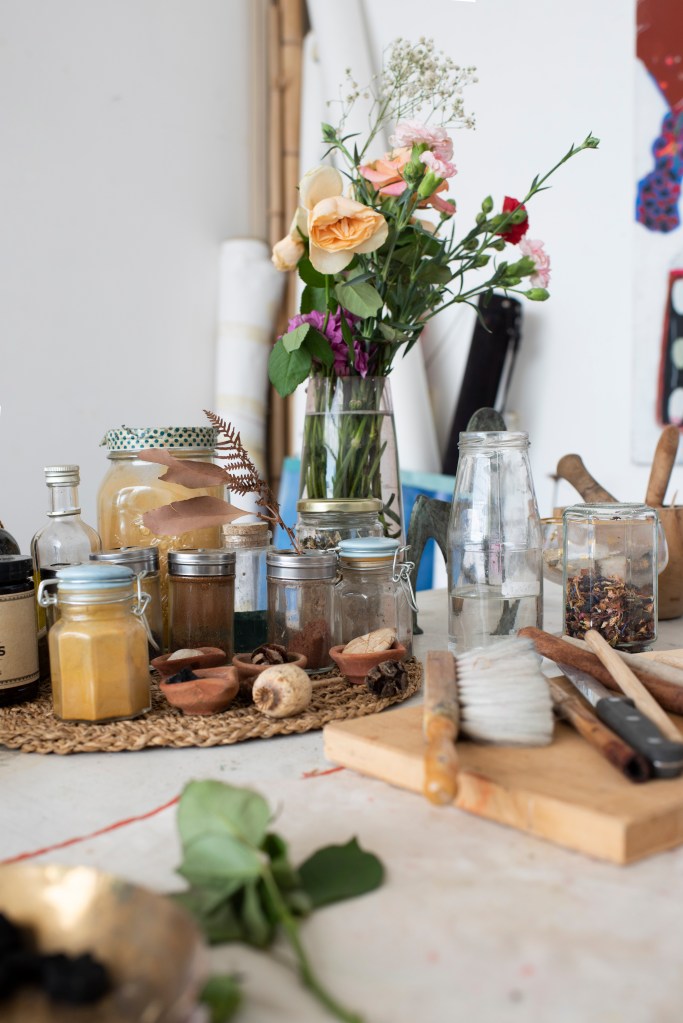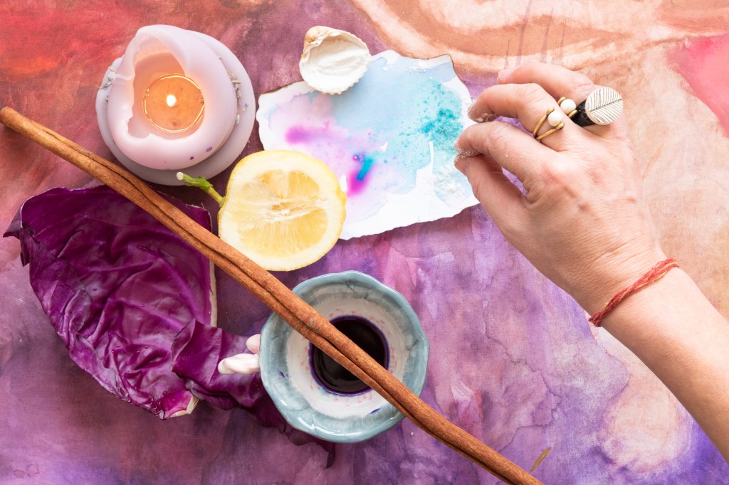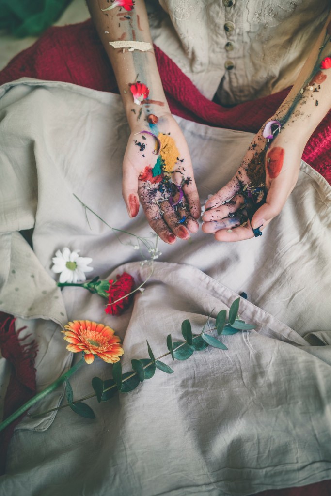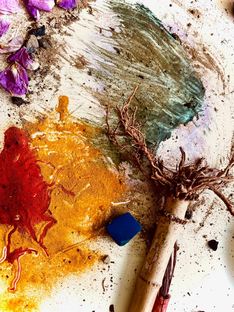 In practice, this means gathering what the Earth offers – soils, stones, leaves, bark, spices, flowers, ash – and transforming these elements into pigments, tools, and textures to create paintings, land art and ritual offerings. The palette is a gift from the Earth. Each color is carefully collected and mixed with water, light, time, wonder and intention.
