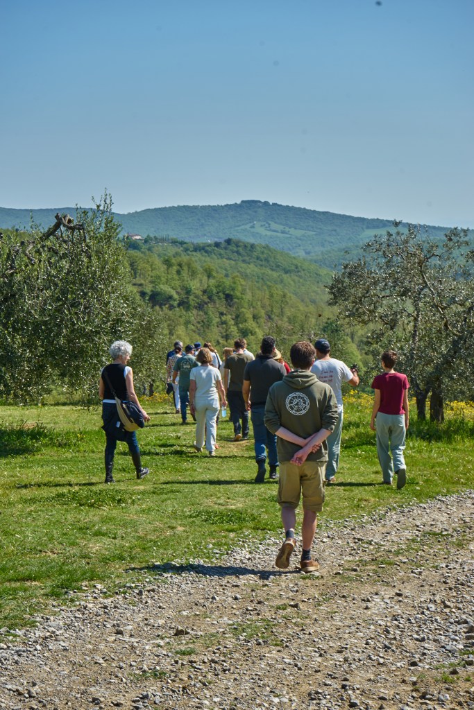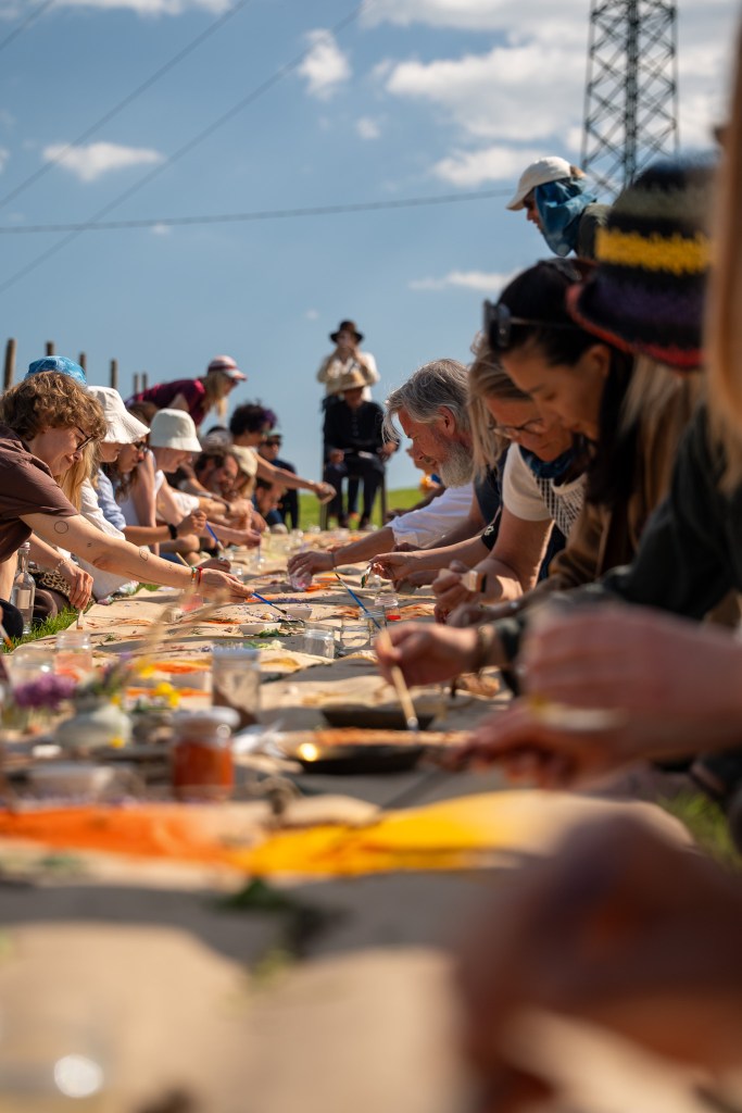 It was a warm afternoon in Umbria last week. Seventy people -activists, farmers, artists, philosophers, investors- sat side by side along a canvas so long it disappeared into the light of the trees, around it the biomimicry cultures growing beautifully at the Quinto Sapore farm. Just gratefulness, earth-pigments, found flowers, brushes, water from the source – and the quiet understanding that something was being made together.